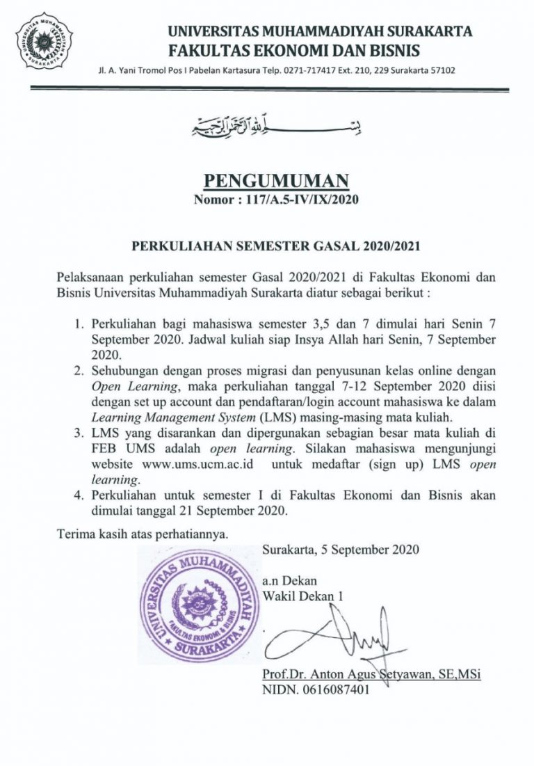 Informasi Perkuliahan SMT Gasal 2020-2021 FEB UMS