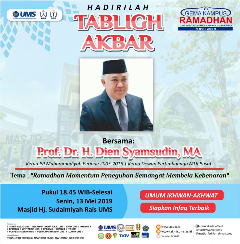 Dalam rangka menyemarakkan bulan Ramadhan 1440H. Pimpinan Universitas Muhammadiyah Surakarta bersama Takmir Masjid Universitas Muhammadiyah Surakarta mengundang seluruh civitas akademika UMS dalam acara TABLIGH AKBAR Gema Kampus Ramadhan Universitas Muhmmadiyah Surakarta 1440 H, yang akan diselenggarakan pada: