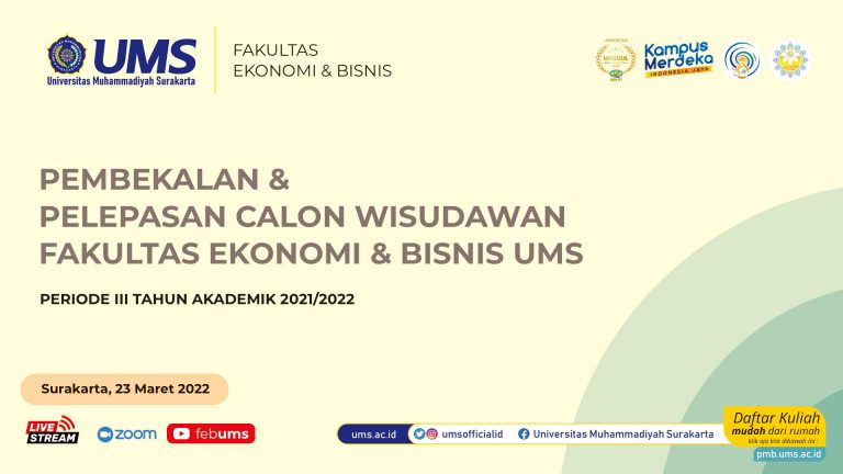 Surakarta, 23 Maret 2022 Fakultas Ekonomi dan Bisnis UMS menggelar acara Pembekalan dan pelepasan calon alumni periode 3 Tahun 2021/2022 secara daring, diselenggarakan di Gedung Auditorium Moh. Djazman Kampus 1 UMS yang hanya dihadiri oleh pimpinan dan calon alumni terbaik dari tiap Prodi.